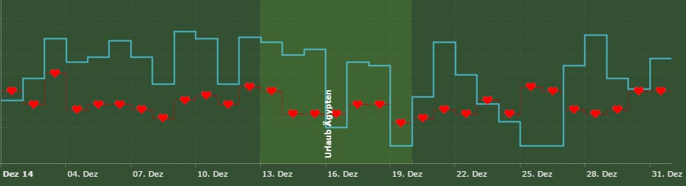 Nachdem im November der Ketonspiegel bis auf ein paar Ausnahmen ganz passabel war, habe ich mit den eher unterdurchschnittlichen Werten im Dezember nicht gerechnet. Allerdings im Angesicht der visualisierten Daten und Messergebnisse im Chart habe ich gleich bemerkt was Sache ist!